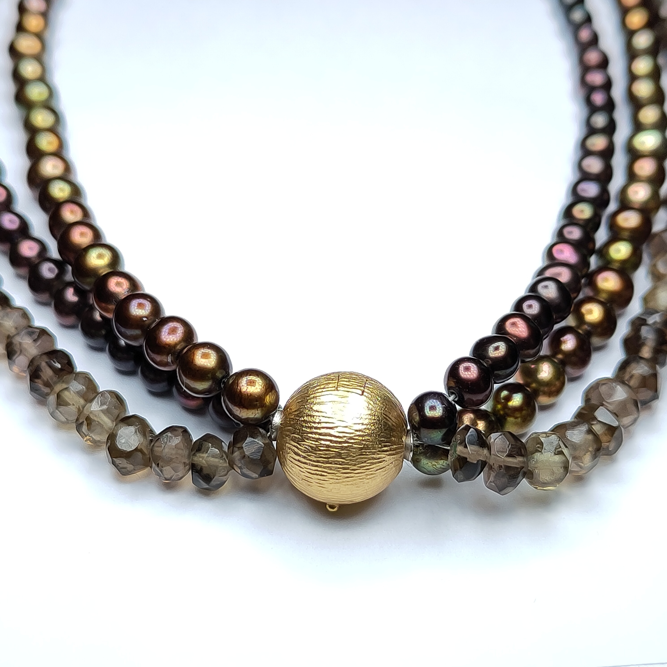Nature Globe Verschluss Mittel, Halskette, von der Kollektion Nature, aus mattem Gelbgold, GG750, mit Steinbesatz aus Rauchquarz braun, Zuchtperlen braun, Länge 45 cm.Eigenschaften: